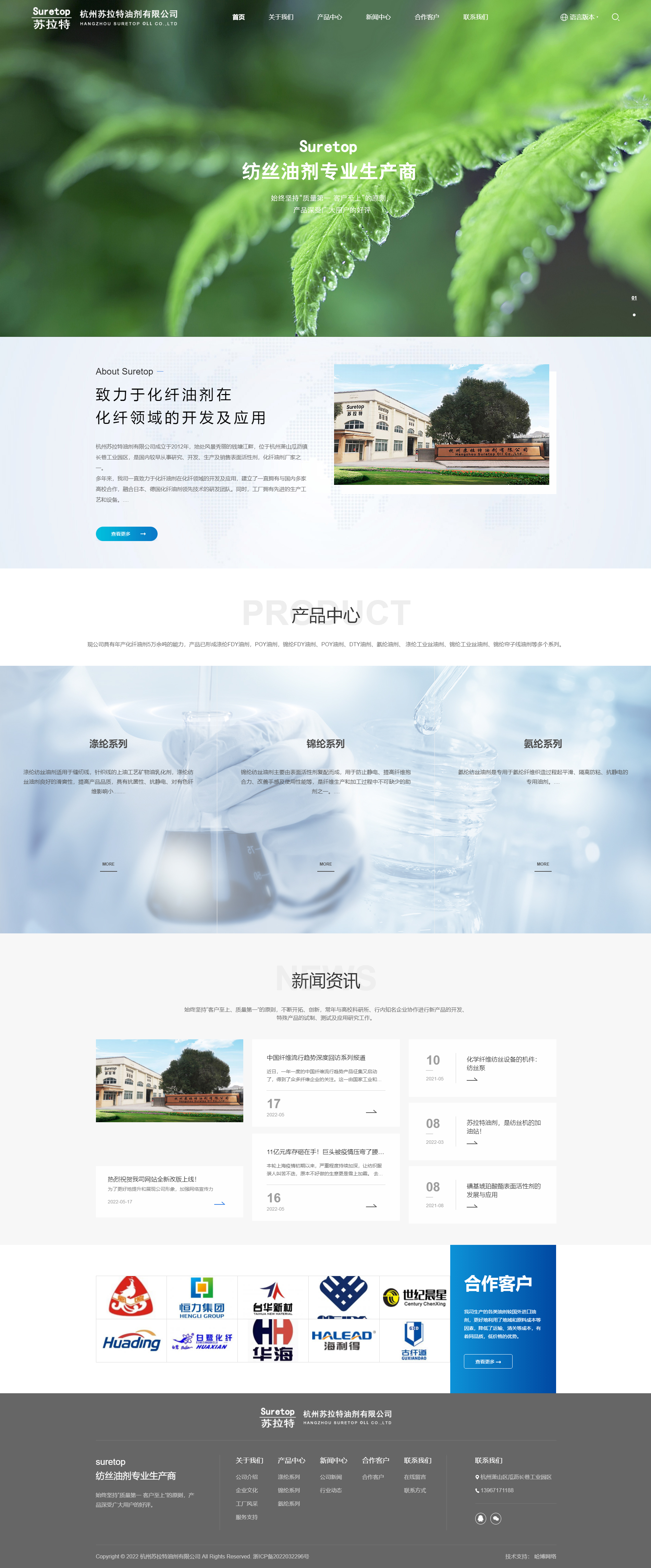 杭州蘇拉特油劑有限公司成立于2012年,地處風景秀麗的錢塘江畔,位于杭州蕭山瓜瀝鎮長巷工業園區,是國內較早從事研究、開發、生產及銷售表面活性劑,化纖油劑廠家之一。