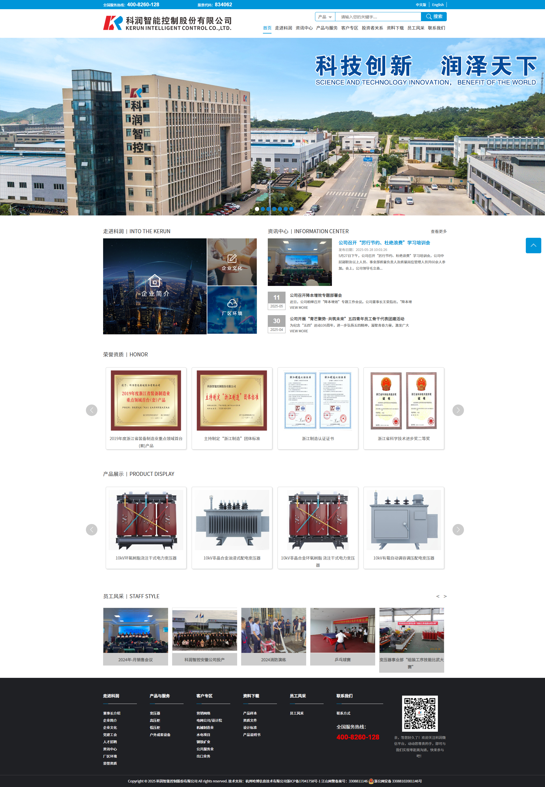 科潤智能控制股份有限公司,是一家專業從事輸配電設備、高低壓成套、電力儲能艙、變壓器、新能源系列產品的研發、生產、銷售、服務為一體的A股上市企業。一直致力于電力及新能源產品的研發和產業鏈的完善,始終專注于品質的提升和科潤品牌的建設,是專精特新“小巨人”企業、國家高新技術企業、國家知識產權優勢企業、國家級綠色工廠、國家級博士后科研工作站、全國模范職工之家。