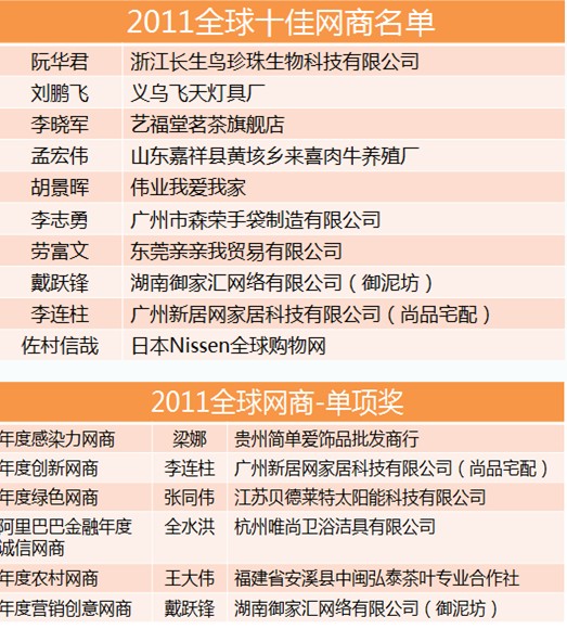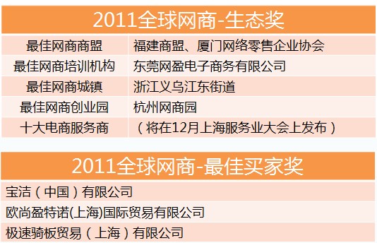 2011全球十佳網商及各單項名單于9月9日晚揭曉: